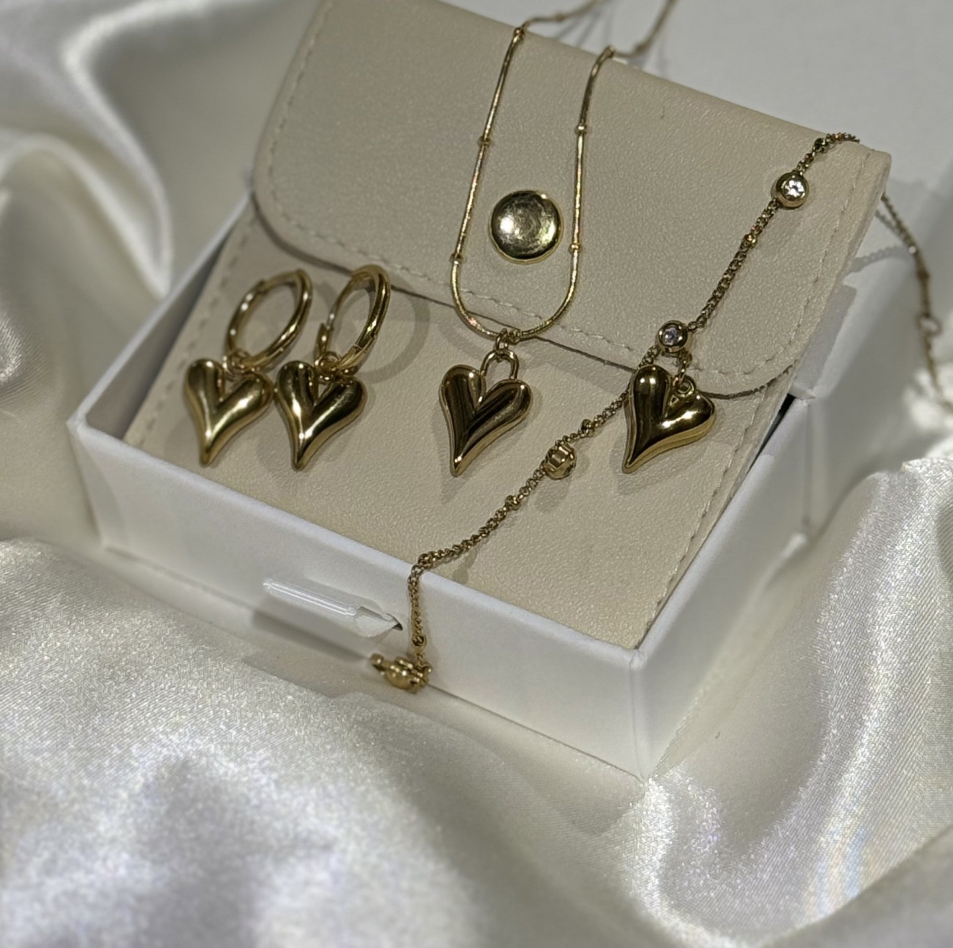 Oure Allure collection is a three-piece set featuring a coordinated necklace, bracelet, and earrings, each adorned with a delicate heart motif that captures light beautifully. Available in both warm gold and cool silver finishes, you can select the colour that complements your personal style and existing collection. Perfect for layering or wearing as a complete set.