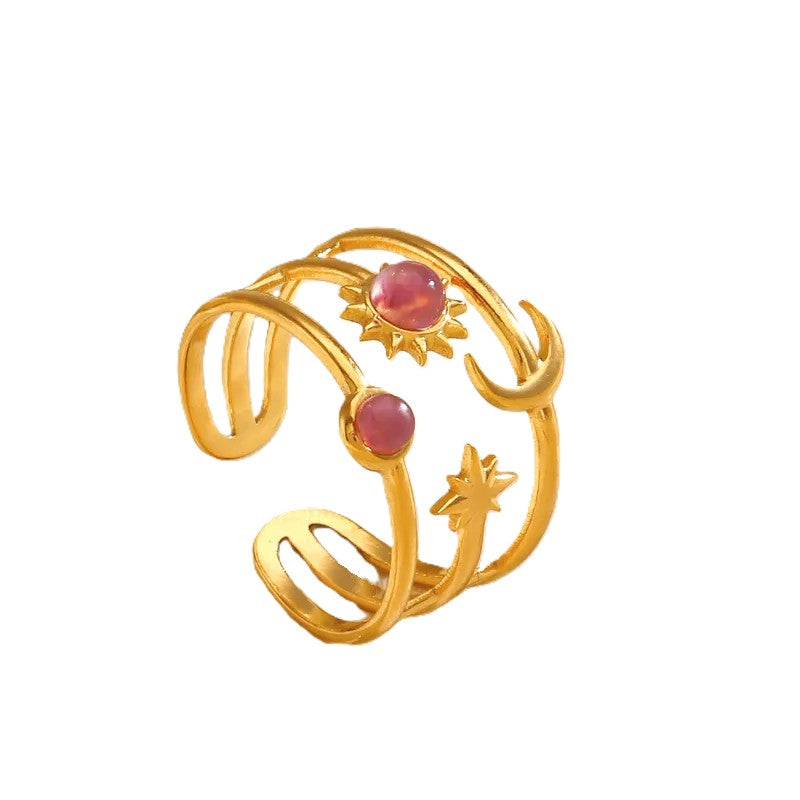 Our Lana Ring features three slender bands adorned with celestial motifs: a star, moon, and sun. Crafted from rich purple resin and elegantly gold plated, this adjustable ring offers a sophisticated blend of colour and symbolism.
