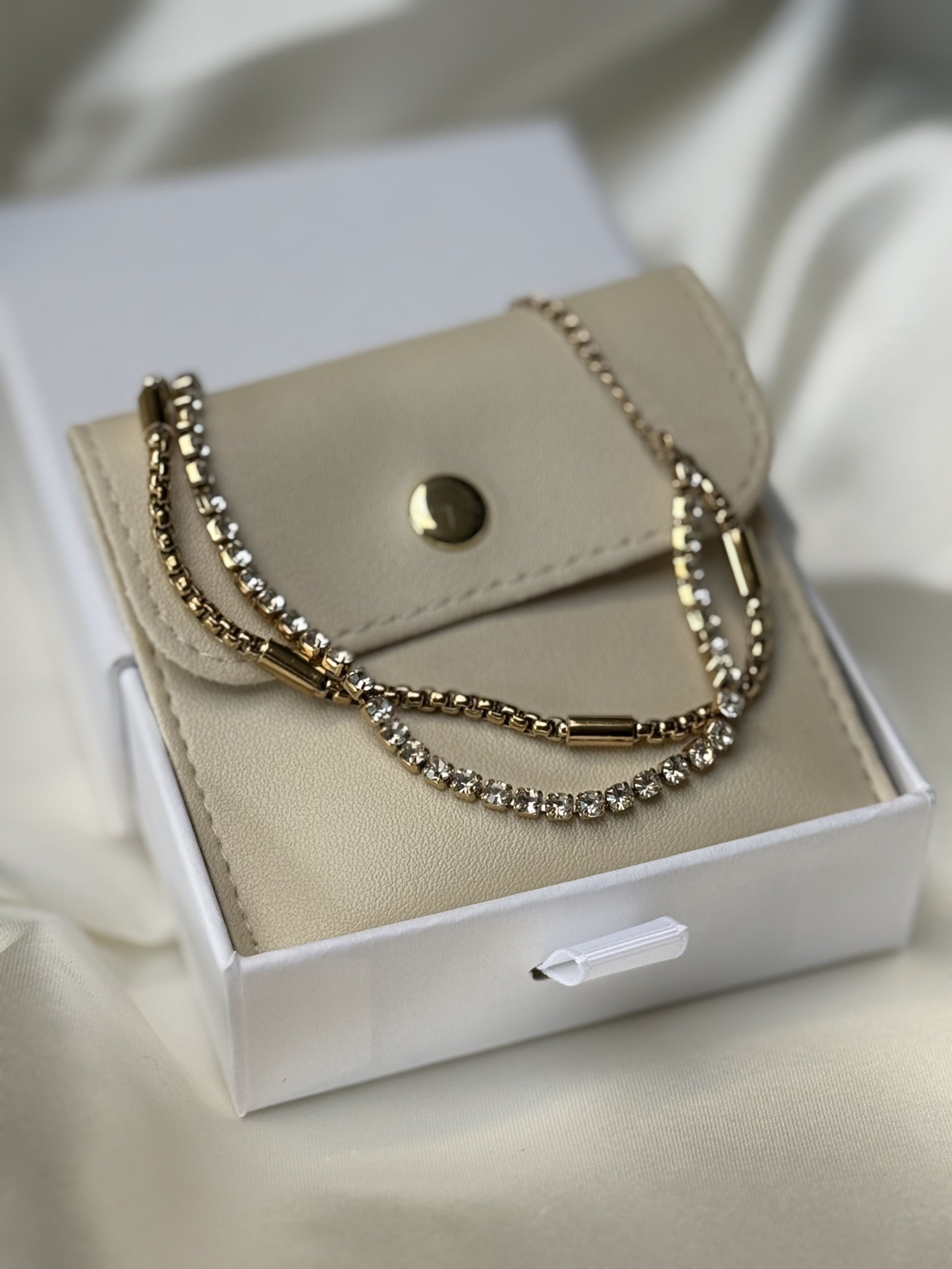 Our Saffron Bracelet pushes boundaries with its fearless dual design. One side showcases a glittering cubic zirconia tennis bracelet that catches every light, while the other features a sleek gold-plated chain. Wear it bold—mix the sparkle with understated elegance, or flip it to match your mood. A statement piece that refuses to play it safe.