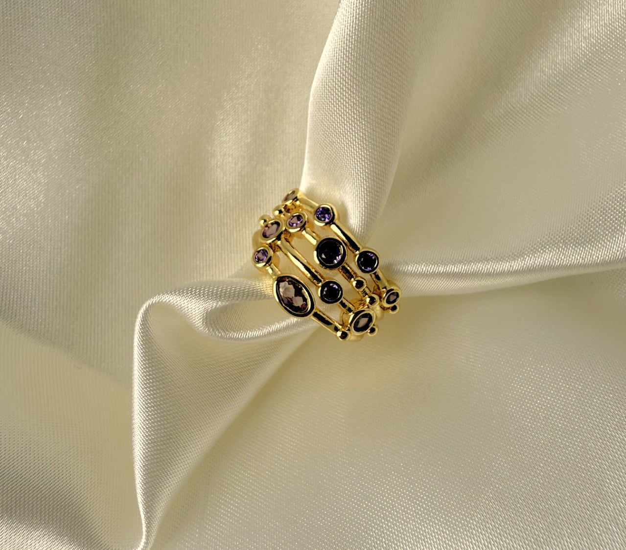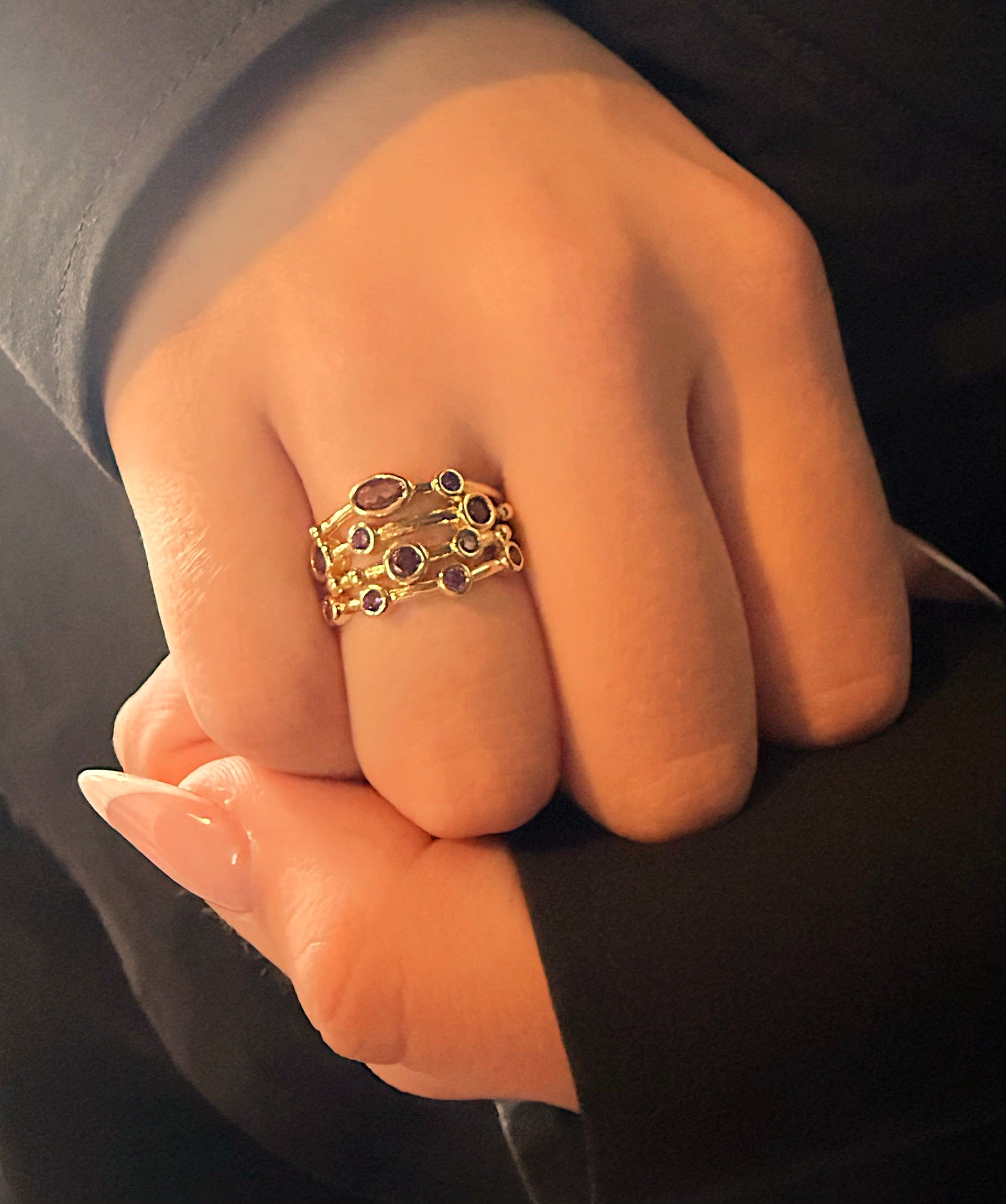 Add a splash of whimsy to your look with our Tracy Ring, featuring four delicate bands scattered with sparkling purple zircon stones. Each band dances with vibrant colour, making this ring a fun and eye-catching accessory to brighten your day. Perfect for stacking or wearing solo, it brings playful elegance to any outfit.